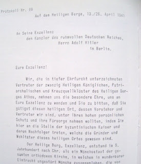 Адолф Хитлер је добио титулу "Високи заштитник Свете Горе" (нем. Hoher Protektor des heiligen Berges), гарантујући Светој Гори очување досадашње аутономије и несметани монашки живот на њој.