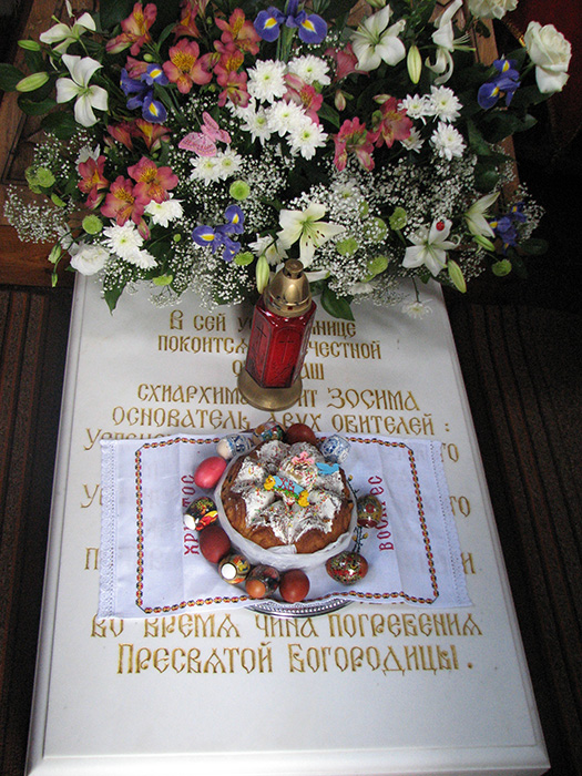 Старац, као невероватан подвижник и ревнитељ Православља, био је прозорљив духовник и оснивач Успенског Свето-Васиљевског и Успенског Свето-Николајевског манастира у Доњецкој епархији. У Русији су га многи знали, а у Украјини су га, као и чувеног оца Николаја Гурјанова, знали и поштовали сви. И одлазили су код њега исто као код оца Николаја обремењени свим својим болима, након чега су добијали исцељење и јасну слику о својој будућности. Он се и упокојио три дана после оца Николаја. Датум упокојења му је Господ открио унапред. У последњих неколико дана старац Зосима је давао мноштво упутстава (која су се касније испоставила као предсмртна) браћи и сестрама обитељи, свима које је успут сретао док је ишао на службу, као и онима с којима се виђао у келији. Једној жени, на пример, рекао је да за два дана почне пећи колаче и да их пече наредних 40 дана без прекида. Философска мудрост, снага вере и познање пута за спасење људске душе учинили су га старцем већ у четрдесетој години живота. Јер старац у Православљу не значи стар већ мудар човек, који се од осталих разликује прозорљивошћу и посебним молитвеним даром. Отац Зосима нас је молио да се покајемо и исправимо сопствене животе, говорио је да морамо униније и очајање у потпуности терати од себе. „Светлост Христова, радост Христова нек нас прати. Немамо разлога да тугујемо мислећи да је Бог окрутан, да нам неће опростити и помиловати нас – то је све лаж. Бог је дуготрпељив и многомилостив, Бог све нас чека. Чека, пружа руке, како бисмо ми, као заблудела деца, похитали у Очинске загрљаје. Отац Небески нам прашта, милује нас и враћа нам изгубљено Царство Небеско“. Они који су имали велику срећу да разговарају са старцем Зосимом враћали су се у световни живот бољи, чистији и светлији. Лечио је људске душе, а самим тим и исцељивао тела. Безгранично је волео људе. Све. И оне који су га мучили, терајући га да данима стоји бос на бетонском поду, и оне који су га слали на службу из парохије у парохију, далеко од магистралних путева и цивилизације – како би га брже сломили. Носио је свој крст достојанствено, не посустајући у вери. Крстио је децу својих мучитеља, преживео четири клиничке смрти и борбу с болешћу. Умирао је, а затим устајао и служио. Лекари су комуницирајући са њим и дивећи се његовој храбрости постајали верујући. Он је био духовник свештенства целе Доњецке епархије, браће и сестара двају манастира чији је био оснивач и омиљени отац многих мирјана који су га четврт века посвуда пратили. „Мене је увек поражавала његова истрајност у изградњи храмова – причао је Митрополит доњецки и мариупољски Иларион (Шукало). – Где је год дошао да служи, свуда је одмах започињао капиталне радове и изградњу. Сећам се како смо на празник иконе Почајевске Мајке Божије 1980. године, када сам ја још био црквењак у Свето-Успенском храму у Доњецку, отишли код о. Саватија на освећење новог престола у Александровку. Он је успео да направи тај престо у истом оном периоду, када су се цркве у СССР-у затварале и рушиле. У тим временима је то била готово сензација“. Капела у којој се налази гробница о. Зосиме и Успенски храм у Никољском. Васкрс 2009.